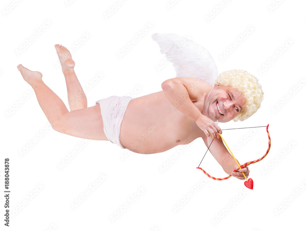 Funny Angel With Arrow Flying Isolated On White Background Adult Male Angel Focus Arrow Fat Angel Aiming Arrow Threaten Of Love Stock Photo Adobe Stock